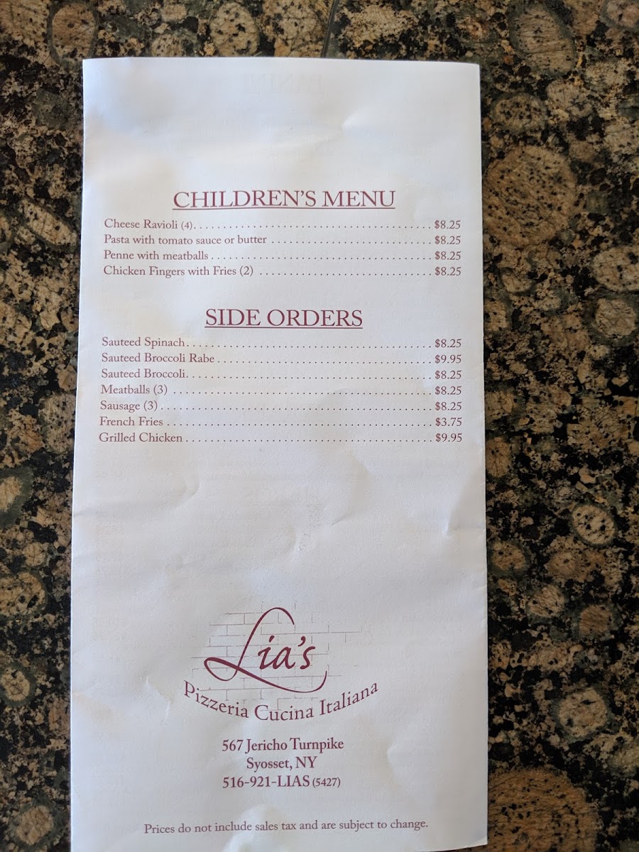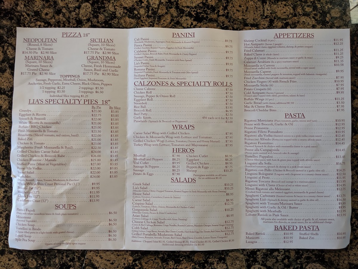 Lia's Pizzeria Menu